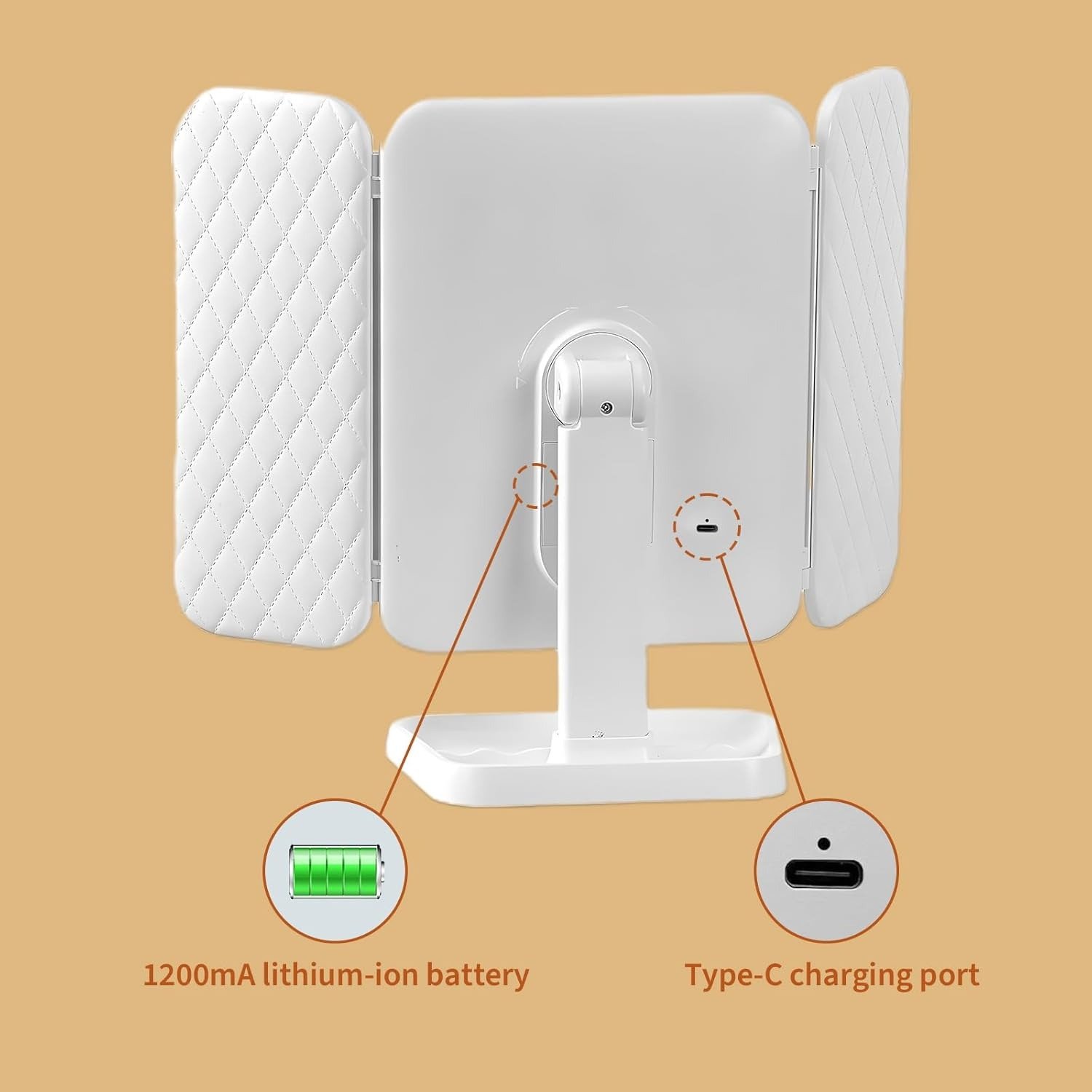 - RECHARGEABLE & INTERNAL BATTERY: The Tri-fold makeup mirror has a built-in high-performance 1200mAh rechargeable lithium battery that lasts for 4-6 hours on a full charge. Universal Type-C charging port, even if we lose the included USB power cable the countertop cosmetic mirror can continue to be used !